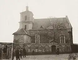 In November 1906, the society decided to establish a legal five-year co-ed Lithuanian school. The permit was received in March 1907. The official founders of the school was Antanas Vileišis and Povilas Matulionis.[49] The school opened with 26 students at the clergy house of the Church of Saint Nicholas on 16 August 1907. Most students and materials were transferred from the semi-legal primary school.[50] In February 1908, the city duma granted eight neglected rooms for the school in the former Franciscan monastery near the church.[51] After repairs, the school occupied five rooms, society's library and museum took two rooms, and the last room was used as the board room.[52] The new school officially opened on 22 October 1908.[53] The Mutual Aid Society covered the tuition and provided other financial support (e.g. school supplies, proper clothing and shoes) to the impoverished students.[54] This was a heavy burden on the society's budget; in 1912–1913, almost all of its revenue of 1,237 rubles was spent on the school.[55] The school faced particular difficulties during World War I when the number of students jumped to 107 due to war refugees arriving to Vilnius.[56] The school was closed in May 1918 when, due to epidemics, the occupying German authorities closed all schools that did not have their own dormitories.[57]