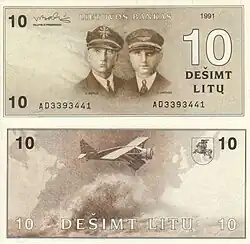 | 10 Litų | €2.90 | 1991 | | Obverse: Steponas Darius & Stasys Girėnas Reverse: Lėktuvas Lituanica | American Banknote Corporation, USA | 1996 January 1 | |
