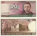 | 20 Litų | €5.79 | 1991 | | Justas Tolvaišis | Obverse: Maironis Reverse: Sculpture "Freedom" by J. Zikaras | American Banknote Corporation, USA | 1994 June 1 |