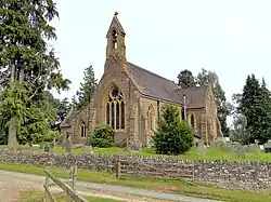 There are five listed buildings in the parish. The 1869 Anglican Church of St Mary by W. Chick on Ruff Lane is rated Grade II*,[18] its churchyard gate piers and walls, again possibly 1869 by W. Chick, being Grade II.[19] Other Grade II buildings are 1 mile (2 km) south-east from the church at Cider Mill Farm on the Wriggle Brook, being the 17th-century and later New Mills Farmhouse,[20] with its associated 1801-dated barn,[21] and granary with former cider house, both c.1800, and a store at the time of listing.[22][23]