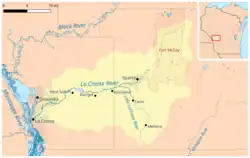 The La Crosse River rises in northern Monroe County and flows generally west-southwestwardly into La Crosse County, through the Fort McCoy military installation and past Sparta, Rockland, Bangor and West Salem. It flows into the Mississippi River at the city of La Crosse.[4]