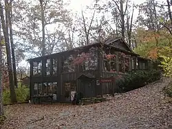 The Esta Cabin encapsulates the history of the Loomhouse, and is the cabin where the song "Happy Birthday to You" was first sung.[2][3] The cabin was first built by a Beoni Figg in 1870 as a business office for his charcoal, lumber, and quarries interests. It has been enlarged since then from a two-room cabin. One of these enhancements replaced the vertical split log siding with board and batten.[4] In 1939 Lou Tate acquired the cabin and based her weaving business there, living on the property until her death in 1979. On a visit in the 1940s while still the First Lady, Eleanor Roosevelt crushed a floorboard, which she later signed; it is now lost. While visiting the Loomhouse, Mrs. Roosevelt bought woven mats that would see use in the White House.[5] Displays of weaving decorate the interior.[6]