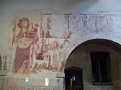 Inside the nave are several Mediæval wall paintings. Most are 13th-century, including a large Saint Christopher[10] in the customary position opposite the south door. Also 13th-century are the paintings of the Martyrdom of St Catherine, Passion of Christ, Crucifixion of Christ, and Archangel Gabriel. There are also 14th-century paintings of the Nativity of Christ and Christ in Majesty, and a 15th-century painting of the Seven deadly sins.[16]