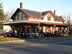 The Fitchburg Railroad was extended westward from Cambridge between 1843 and 1845, reaching Littleton around November 1844.[2]: 202 Residents at Littleton Common did not like the appearance of the railroad, so it was routed through what was called West Littleton or Harwood Junction instead.[3]: 129 A large two-story station was placed there at the intersection of King Street and Taylor Street.[4] The long building included separate rooms for passengers and freight, and a living area for the station master. In 1879, the Fitchburg replaced it with a Victorian-style depot building a few feet to the east. The old station was moved south on Taylor Street and served as an apartment building for some time thereafter.[3]: 130