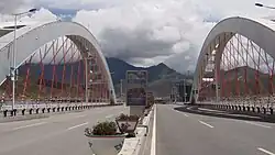 The Liuwu Bridge was built by China Communications Construction and Tibet Skyway.[3] The construction project began in 2004.[4] On February 14, 2007 the two principal spans of the bridge were integrated as planned, and the minor compartment beams of the northern main span have also been cast, signifying the conclusion of the extensive concrete pouring for the Lhasa Liuwu Bridge.[5] The completion of the bridge occurred in April 2007.[6][7][8] It was opened to traffic on 1 May 2007.[9] Total funding allocated to the project was RMB 388.51 million.[4]