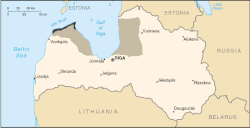 Map of Latvia showing the historical distribution of the Livonian language (in grey) and the current areas with some knowledge of it (in black)