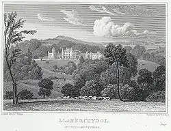 Llanerchydol Hall is located in parkland between the A458 to Llanfair Caereinion and A490 to Llanfyllin. The hall, a 15,440 square feet (1,434 m2) largely intact early 19th-century picturesque Gothic Revival house, is a Grade II* listed building,[2][3] and its well preserved park and gardens are listed, also at Grade II*, on the Cadw/ICOMOS Register of Parks and Gardens of Special Historic Interest in Wales.[4] The site has a long history of occupation, including a Tudor house which burnt down in about 1776, after which David Pugh, a local man who made a fortune selling tea in London, bought the site and built a new house which became known as Llanerchydol Hall.[3][5]