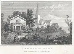 In 1872 the church built by the 2nd baronet in 1824 was demolished, with £1,000 (equivalent to £100,000 in 2023)[19] donated by the owners of Nannau to build a church which took 1 year to complete. The Bishop of Bangor, James Colquhoun Campbell gave the sermon, the day was to coincide with 30 years after the death of Vaughan, the 2nd baronet.[20] The tower still stands from the original 19th century rebuild. The church memorials are for Nanneys and Vaughans of Nannau and also the Morgan family of Hengwrt; there is also a memorial to Rice Jones, a Welsh poet. The churchyard has four ancient yews.[4][21]