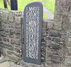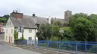 Its name is a combination of Welsh llan "church" + Mair "Mary" and caer "fort" + Einion, a personal name, meaning "the church of Mary [at] the fort of Einion".[3] The town is built upon the site of an old Roman fort. The site of the Battle of Maes Moydog (1295) is nearby. In 1758 the town was almost completely wiped out by a major fire.[4]