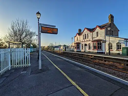 Opened in 1848 it was initially the terminus of the line from Holyhead before the opening of the Britannia Bridge to the mainland in 1850.[1] It suffered a catastrophic fire on 13 November 1865 and had to be completely re-constructed. It was closed in 1966 but reopened in 1970 due to the fire on the Britannia Bridge again as the terminus for trains from Holyhead, with a single wooden platform. It was again closed in 1972 and subsequently reopened again 1973 with both wooden platforms (the only one on the island), which was refurbished in 2017[2] and the signal box remain from the original configuration, but converted into a gate keeper's box, meaning no junctions or signals are controlled from there, except for gate locking. However, a turntable, sidings and goods yard have disappeared, the latter two under a car park.[1]