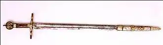 The sword Lobera (Spanish: la espada lobera, literally: "the wolf-slaying sword") was the symbol of power used by Saint Ferdinand III of Castile, instead of the more traditional rod, and so the king will be depicted with orb and sword in hand.