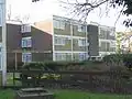Crawley was designated a New Town in January 1947, and the Crawley Development Corporation was set up[43] to acquire land, raise finance and provide all the buildings and services required to meet the aims of planning consultant Anthony Minoprio's masterplan—the most important of which was to reach a target population of 50,000 by 1962.[44] Self-contained residential areas ("neighbourhoods") were laid out around the existing town centre, which was greatly extended. The ancient village of Ifield, the mostly Victorian development of Three Bridges (centred on a pre-railway era hamlet with a pub and village green)[45] and other nearby settlements were all joined up.[46] Each neighbourhood had standard features at its centre: one or more churches, a community centre, a shopping parade, a pub and, in some cases, schools.[47] Some of the better-quality buildings have been awarded locally listed status. The Anglican churches in the Southgate and Gossops Green neighbourhoods (built in 1958 and 1962 respectively), Pound Hill's Roman Catholic church of 1965, with its "striking" triangular design, and the nearby United Reformed Church building (erected in 1955–57 for Congregationalists), are all on the list. So are the shopping arcades at Gossops Green and Tilgate: the former, described as "excellent" by Nikolaus Pevsner, dates from the mid-1960s,[48] while Tilgate's is from the previous decade.[49] The "impressive" structure was on one occasion visited by a delegation of civic dignitaries from Yugoslavia, who travelled to Crawley to inspect its architecture:[50] such visits were common in the early New Town era (for example, more than 2,000 official visitors from 48 countries came in 1958).[51] A 1950s primary school in Tilgate, with a distinctive tower which is believed to hide the chimney of an incinerator, also features on the list.[49] There were few flats anywhere in the New Town, as incoming residents preferred houses,[52] but the Deerswood Court development (which preserved the grounds of the old mansion whose site it occupied) won a Civic Trust Award and has been locally listed.[53]