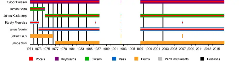 The band was formed in April 1971 by members of previously successful Hungarian rock bands. A poll in Hungarian Youth magazine listing the nation's favorite rock musicians inspired several of the winners to form a new band together.[2] Singer/keyboardist Gábor Presser[3][4] and drummer József Laux had been members of Omega,[5] singer/bassist Károly Frenreisz had been a member of Metró,[6] and singer/guitarist Tamás Barta had been in Hungária.[2] They played their first concert in Budapest in July 1971.[7] Much of their early activity was as a backing band for pop singers, due to Hungary's restrictions on employment for rock musicians; they gained notice in particular for backing Sarolta Zalatnay[8] and Kati Kovács[7] during their first few years of existence.