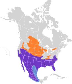 Loggerhead shrikes were once widely distributed across southern Canada, the contiguous USA and Mexico.[12] However, their populations have heavily declined since the 1960s.[19] Four subspecies reside in southern coastal California: mearnsi, gambeli, grinnelli and anthonyi.[24] L. l. mearnsi is only found on San Clemente Island in California, whereas L. l. gambeli breeds on the mainland and L. l. anthonyi breeds on the Channel Islands.[14] L. l. excubitorides is found in central North America, whereas the non-migrating L. l. ludovicianus resides in southeastern North America.[19] The distribution of L. l. migrans ranges from north to eastern North America; however, its range has been diminishing since the 1940s.[13]