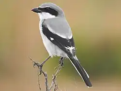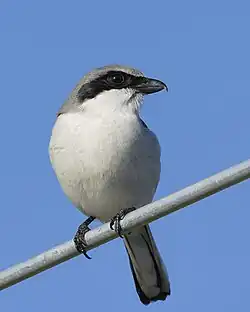 The loggerhead shrike (Lanius ludovicianus) is a passerine bird in the family Laniidae. It is the only member of the shrike family endemic to North America; the related northern shrike (L. borealis) occurs north of its range, however it is also found in Siberia. It is nicknamed the butcherbird after its carnivorous tendencies, as it consumes prey such as insects, amphibians, lizards, small mammals and small birds, and some prey end up displayed and stored at a site, for example in a tree.[3] Due to its small size and weak talons, this predatory bird relies on impaling its prey upon thorns or barbed wire for facilitated consumption.[4] The numbers of loggerhead shrike have significantly decreased in recent years, especially in Midwestern, New England and Mid-Atlantic areas.[5]
