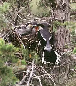 Their vocal range is broad and varied, and has been described as harsh and jarring.[21] The shrike's notes include squeaky whistles, shrill trills, and guttural warbles.[15] The trills sung by males during breeding season vary in rhythm and pitch. When alarmed, a shrike will produce a "schgra-a-a" shriek while spreading out its tail feathers. A distinctive alarm call is often given when threats from above are detected. Nestlings will make "tcheek" and "tsp" sounds shortly after hatching.[22] During courtship feedings, females may ask for food with "mak" begging notes; conversely, males emit "wuut" or "shack" sounds to offer food.[23] The male emits a territorial, harsh shriek, while the female's song is pitched lower and softer than the male's. Generally, the male is far more vocal than the female.[13][22]