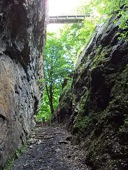 Devil's Gorge is a gorge located in the park with two solid limestone walls that are 30 metres (98 ft) high.[9] Walkers cross a bridge over the gorge as part of a route through the park; it is also a destination for rock climbing and abseiling.[10][11] One climbing route is called the Devil's Haircut.[12]