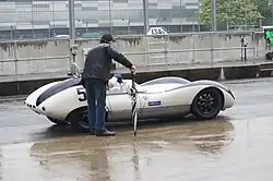 The Lola Mk1 is the first sports racing car made by Lola, under the leadership and guidance of Eric Broadley, in 1958. The body was designed and developed by chief stylist Maurice Gomm, made out of a steel or fiberglass tubular spaceframe chassis, covered in a low-profile, sleek, aluminum skin. The 80 hp (60 kW), 1,098 cc (67.0 cu in), Coventry Climax FWA four-cylinder engine was designed by Harry Mundy and Walter Hassan. The car used a 4-speed manual transmission, and was lightweight, weighing in at a mere 812–840 lb (368–381 kg). It also notably won its class at the 1960 12 Hours of Sebring, being driven by Charles Vögele and Peter Ashdown. At least 32 cars were known to have been built, but the actual number is believed to be between 38 and 42.[1][2][3][4][5][6][7]