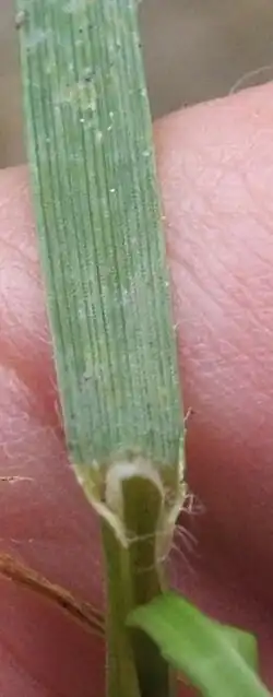The plant is a low-growing, tufted, hairless grass, with a bunching (or tillering) growth habit. The leaves are dark green, smooth and glossy on the lower surface, with untoothed parallel sides and prominent parallel veins on the upper surface. The leaves are folded lengthwise in bud (unlike the rolled leaves of Italian ryegrass, Lolium multiflorum) with a strong central keel, giving a flattened appearance. The ligule is very short and truncated and often difficult to see. The small white auricles grip the stem at the base of the leaf blade. Leaf sheaths at the base are usually tinged pink and hairless. Stems grow up to 90 cm.[2]