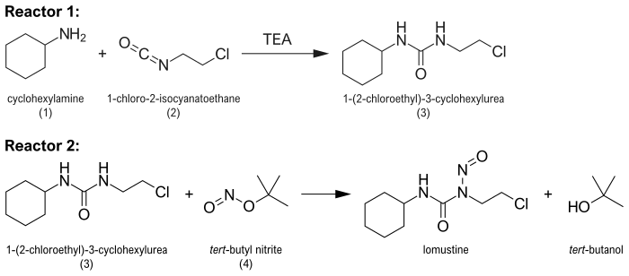 - ^ a b c Diab S, Raiyat M, Gerogiorgis DI (2021). "Flow synthesis kinetics for lomustine, an anti-cancer active pharmaceutical ingredient". Reaction Chemistry & Engineering. 6 (10): 1819–1828. doi:10.1039/D1RE00184A. hdl:20.500.11820/7466f1c6-1f4d-402c-a53e-d4d40f73f3ff. ISSN 2058-9883. S2CID 237643008.