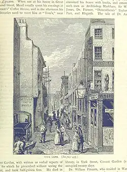 John Bishop, together with Thomas Williams, Michael Shields, a Covent Garden porter, and James May, an unemployed butcher, also known as Jack Stirabout and Black Eyed Jack, formed a notorious gang of resurrection men, stealing freshly buried bodies for sale to anatomists. In his subsequent confession, Bishop admitted to stealing (and selling) between 500 and 1,000 bodies,[5] over a period of twelve years. The corpses were sold to anatomists, including surgeons from St Bartholomew's Hospital, St Thomas' Hospital and King's College. The Fortune of War Public House, at Pye Corner in Smithfield, was identified as a popular resort for resurrectionists.[6] The Fortune of War pub was demolished in 1910.