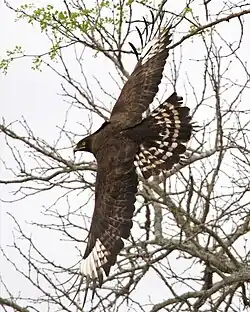 The long-crested eagle is a distinctive eagle when perched due to the long, shaggy crest and all dark plumage often called Kamusungu-sungu in Uganda. The adults are blackish-brown with long, thin feathers growing from the rear of the crown which are held erect to form a crest. The secondary feathers are black barred with light grey and with broad black tips, the primary feathers and median underwing coverts are white, forming a noticeable white patch on the upper and lower surfaces of the wing which is visible in flight. The tail is black, barred with pale grey.[2] The eyes of adults are bright yellow but can be darker in females, and the cere and feet are yellow, paling to white in males. The juveniles are similar to the adults, but the plumage is lighter in colour and the crest is not developed and their eyes are grey. The body length is 53–58 cm (21–23 in) and the weight of the female is 1,300–1,500 g (46–53 oz), while the smaller male is 912–1,300 g (32.2–45.9 oz).[3]