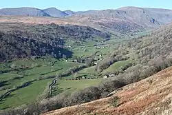 The valley is bounded to the west by Kentmere Pike and Shipman Knotts, one arm of the Kentmere Horseshoe, and to the east by Sleddale Fell and its summits of Grey Crag and Tarn Crag; one of several Cumbrian hills named Great Howe is on the east of the valley above Sadgill.[2][3] The River Sprint starts on the slopes of Harter Fell and Branstree, and flows south through the valley before joining the River Kent to the north of the town of Kendal.