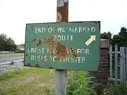 The Longster Trail was devised in the 1970s but the path was first opened and properly waymarked during the 1980s. It was named after Frank Longster, a local man who served as chairman of the Mid-Cheshire Footpath Society during the 1970s until his death in 1974.[1] The path is waymarked with two waymarks, both the older yellow arrow and red dot markers and the newer yellow arrow which encloses the words Longster Trail.