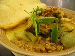 Lontong kari is lontong served in soupy chicken curry and vegetables. It is become a specialty breakfast of Parahyangan region.[9] Kari was first brought to Indonesia by Buddhist monks from India.[10]