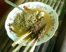 Lontong krubyuk is a traditional Karimunjawa dish. The term lontong krubyuk itself comes from the Javanese language krubyuk or ngrubyuk means walking in water or puddles. This name corresponds to the appearance of a dish that contains a lot of gravy. A serving of lontong krubyuk comes with lontong, half-cooked bean sprouts, sliced celery leaves, and shredded chicken stew, and then is poured with broth.[12]