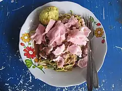 Lontong mie is one of the popular dishes in Surabaya. It consists of slices of lontong, yellow noodles, fried tofu, petis (shrimp paste sauce), bean sprouts, lento (black-eyed pea fritter), and fried shallots.[13]