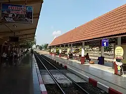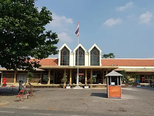 Lopburi railway station is a class 1 railway station in the centre of Lopburi, Thailand, located 133 km (83 mi) away from Bangkok Station. It is a terminus for commuter train services on the Northern Line.[1] Two large golden monkey sculptures are located on the platforms as the monkey is the symbol of Lopburi. The opposite side of the station building is an important archaeological site of Lopburi, Wat Phra Sri Rattana Mahathat.[2]