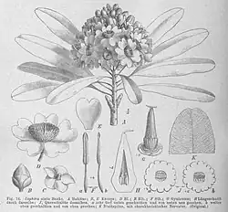 Lophira lanceolata is a small deciduous tree growing to a height of 16 m (52 ft) or more. The tree has a narrow crown and steeply ascending branches, and forms suckers readily.[1] The trunk is usually unbranched to around 8 m (26 ft) and can reach a diameter of about 70 cm (28 in). The bark is grey and corky, coming away in coarse flakes. The leaves are clustered at the end of the twigs. They are alternate, narrowly oblong, simple and entire, with rounded or notched apexes. The new foliage is pink or red at first. The inflorescence take the form of a loose panicle at the end of the shoot. The individual flowers are bisexual, scented and white, with parts in fives. This is followed by a partially woody, conical achene surrounded by a winged calyx, containing a single, large seed.[2] The tree is very similar to the closely related Lophira alata but is smaller, has narrower leaves with longer stalks, and larger seeds.[3]