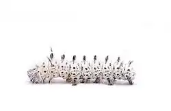 The larva, a caterpillar, is completely covered in long, hairlike setae arranged in spreading tufts. Most are white, but there are black tufts along the middle of the back, and four long black hair pencils, two near the front, and two near the back. There are black spots along the sides, and the head capsule is black. The hairs cause itchy rashes (contact dermatitis) in many people, particularly those prone to allergies, and may resemble exposure to urushiol.[4] They are microscopically barbed and may rarely cause serious medical complications if they are transferred from the hands to the eyes,[5] but in over 350 documented cases, most were asymptomatic within 24 hours, and none involved anaphylaxis.[3]