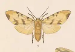 Primaries pale brownish yellow, with a small orange coloured spot close to the base, three large spots along the costal margin, a large elongated patch on the outer margin, and two rather broad streaks on the inner margin partly crossing the wing towards the middle, all pale brown. Secondaries pale yellowish white, partly hyaline (glass like) near the base. The underside of the primaries as above, but with all the markings more indistinct. The head and thorax the same colour as the primaries; the abdomen above orange, the anus and the underside whitish; the legs and antennas orange brown. Wingspan 2+1⁄4 inches (57 mm).[2]