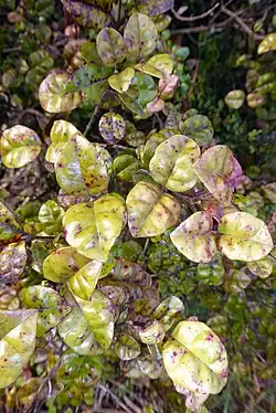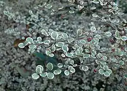 ![]() | Lophomyrtus obcordata | Rōhutu | Grows to around 8 m tall but is more tree-like in form. It has very small inversely heart-shaped (petiole at the pointed end) leaves and produces clusters of tiny white flowers in summer that are followed by small dark red to purple-red berries. The cultivars 'Dainty' and 'Microphylla' have pink-tinted leaves. | It occurs throughout New Zealand except for much of Southland. |