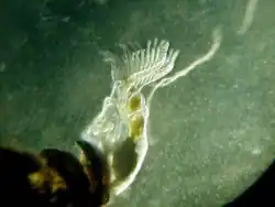 The lophophore (/ˈlɒfəˌfɔːr, ˈloʊfə-/)[1] is a characteristic feeding organ possessed by four major groups of animals: the Brachiopoda, Bryozoa, Hyolitha, and Phoronida, which collectively constitute the protostome group Lophophorata.[2] All lophophores are found in aquatic organisms.