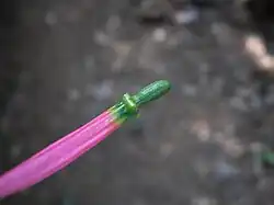 The floral characteristics indicate that it is ornithophilous in nature and has moderate quantity nectar stored in its perianth tube. The mature buds require external factors like tripping to ensure that they open up. In the absence of this, the buds fall off without opening. Birds help in this process and mature buds eject a cloud of pollens that sticks to the head or beak of the probing bird. The birds seen visiting these flowers in India are Tickell's flowerpecker, purple-rumped sunbird, purple sunbird and spider-hunter.[11][12]
