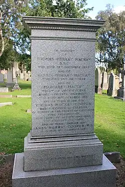 Lord Cooper of Culross died in July 1956, aged 62, at which point the barony became extinct.[2] He is buried with his parents near the centre of the SW section of the original Grange Cemetery in south Edinburgh.