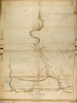 In 1665, the Jesuits distributed the first plots of land in Batiscan in a row along the St. Lawrence River, between the Champlain and Batiscan Rivers. From March 1666 to May 1667, seventy concessions were allocated to pioneers in a row along the north shore of the St. Lawrence River. At the end of the 17th century, land concessions were granted to pioneers along the eastern side of the Batiscan River. Sometimes the land was assigned or occupied informally occupied by pioneers without a notarial contract, a situation that was normalized a few years later with an official contract. Several concessions were awarded to ex-soldiers who were exempt from the usual obligations owed to Jesuit lords.[8]