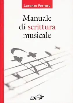 In 2007 Lorenzo Ferrero was appointed to the board of directors and elected vice-president of SIAE, the Italian Authors and Publishers Association. That same year he published the Manuale di scrittura musicale,[2] a manual which describes the basic rules of correct and elegant music writing from the orthographic as well as the graphic point of view, which is addressed to all composers, musicologists, teachers, students and copy-editors in need of practical advice. In 2008 he translated, edited and published Lo studio dell'orchestrazione,[3] the Italian edition of Samuel Adler's The Study of Orchestration, a landmark orchestration manual.
