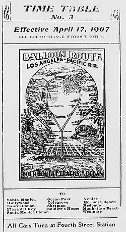 The Balloon Route Trolley trip was a featured excursion of the Los Angeles Pacific, and opened in 1901. Beginning in November, 1904, Charles Merritt Pierce, the original owner of the Glen-Holly Hotel, Hollywood's first hotel, operated the line for the LAP.[38]