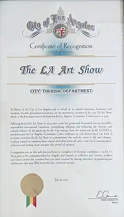 In 2020, Kassandra Voyagis stepped up to assume management and leadership as Producer-Director of the show. Navigating the pandemic, the show was rescheduled the following year, and returned as an in-person show in July 2021. Los Angeles Mayor Eric Garcetti attended the opening and presented the show with a Certificate of Recognition from the City of Los Angeles for the many contributions LA Art Show has made over the years.