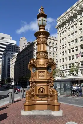 A plaque commemorates its role as a meeting point in the aftermath of the 1906 San Francisco earthquake and fire. Another plaque mentions the opera soprano Luisa Tetrazzini, who gave a memorable performance for the people of San Francisco at the fountain on Christmas Eve, 1910, after legal difficulties prevented her from appearing on stage.[4] The bronze column was added in 1916 to match the height of new lights being installed along Market Street.