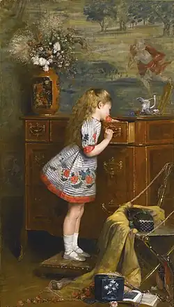 Louis-Charles Verwée was a portrait and genre painter. Most of his works depict interior scenes with some anecdotal event. These usually involve young women or children engaged in some mundane activity such as pressing a lemon, reading a book or rummaging through a drawer. He was particularly skilled at capturing the spontaneity of the intimate moments of his characters.[2]