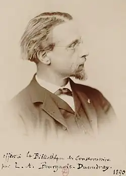 Louis-Albert Bourgault-Ducoudray (2 February 1840 – 4 July 1910) was a French Breton composer, pianist, and professor of music history/theory at the Conservatoire de Paris as well as a Prix de Rome laureate. He was born at Nantes and died at Vernouillet, near Dreux. Debussy was one of his protégés.