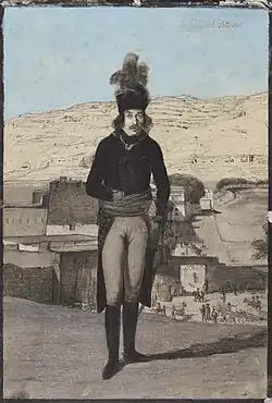 Desaix was born to a noble family in the Château d'Ayat in Ayat-sur-Sioule, in the province of Auvergne,[1] to Gilbert des Aix, Lord of Veygoux, the family manor in Charbonnières-les-Varennes, and Amable de Beaufranchet, his wife and first cousin.[2] Desaix received his military education at the school founded by Marshal d'Effiat, and entered the French royal army. During his first six years of service, he devoted himself to duty and to military studies. When the French Revolution broke out, he threw himself into the insurrectionist cause. Refusing to "emigrate", he joined the staff of Charles Louis Victor de Broglie, the Jacobin son of the duc de Broglie. This nearly cost Desaix his life, but he escaped the guillotine, and by his conspicuous service soon came into favor with the Republican government. Like many other members of the old ruling classes who had accepted the new order, the instinct of command joined to native ability, brought Desaix career success, and thus he had attained the command of a division in 1794.[3]