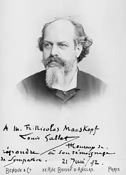 Louis Gallet (14 February 1835 in Valence, Drôme – 16 October 1898) was a French writer of operatic libretti, plays, romances, memoirs, pamphlets, and innumerable articles, who is remembered above all for his adaptations of fiction —and Scripture— to provide librettos of cantatas and opera, notably by composers Georges Bizet, Camille Saint-Saëns and Jules Massenet.