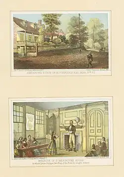 Louis Philippe and his brothers were not officially received as royals at the British court, but they were able to blend in socially with the English aristocracy, and by November 1801 Louis Philippe admitted to his brothers that he was "putting down roots in the country".[8] By October 1803, his new loyalties led to a clash with Charles Philippe, Count of Artois (the future king Charles X), when he wore the Hanoverian black cockade in place of the French white cockade on inspecting French royalist volunteer troops in London.[9] In July 1804, he wrote to the Bishop of Llandaff that global security and the future of humankind depended on England's resistance to Napoleon.[10] In the summer of 1807, he moved his residence from Twickenham to the Duke of Kent's Castle Hill Lodge.[11]