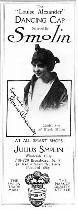 When she returned from a trip to Paris in 1921 she was described in the press as, "Louise Alexander, formerly of the Follies, who recently opened a retail millinery and dressmaking shop, returning from her first buying trip."[55]